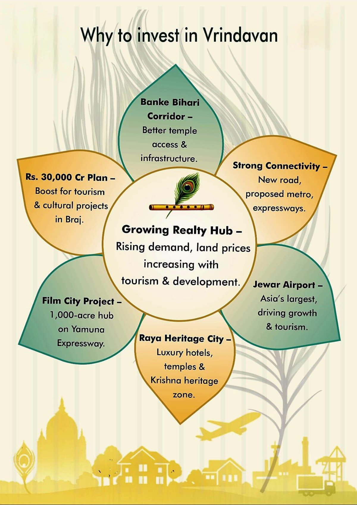 Ideal for Weekend Homes & Rentals: Peaceful surroundings, spiritual ambiance, and proximity to Delhi-NCR make Vrindavan a popular spot for weekend getaways. This also offers excellent potential for short-term rentals and Airbnb stays.